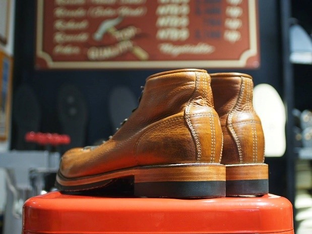 圖中的 Monkey Boots 原為白底配置,與客人討論後,最終決定了此款混麻布袋的半底配置,而成品出來的樣子也非常漂亮。