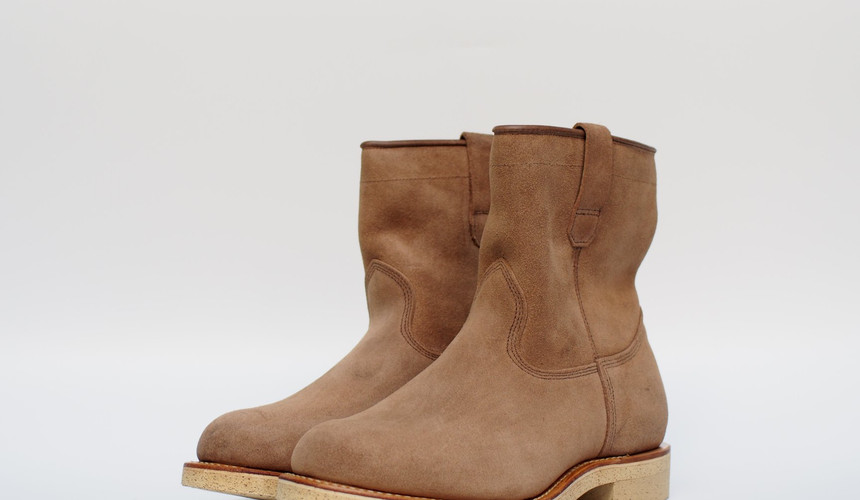 為了重現那雙老靴淺色反皮的舊化效果,皮面的選擇首選當然是美國芝加哥老廠Horween所生產的Chromexcel自然色(natural)反皮。這款皮革是Viberg的著名靴款Boondockers所使用的同款皮面,其舊化效果早已是有目共睹!